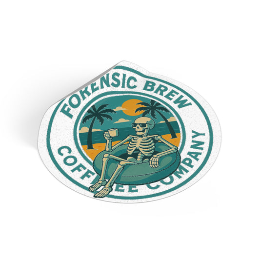 Forensic Brew Coffee Company Round Vinyl Sticker — Retro Skeleton Beach Logo